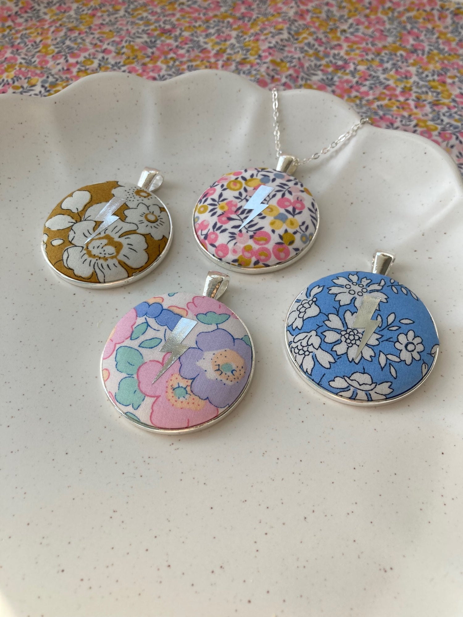Necklaces, keyrings, tote bags and pins which capture beautiful Liberty of London fabrics, uplifting colours, joyful patterns and kind words.