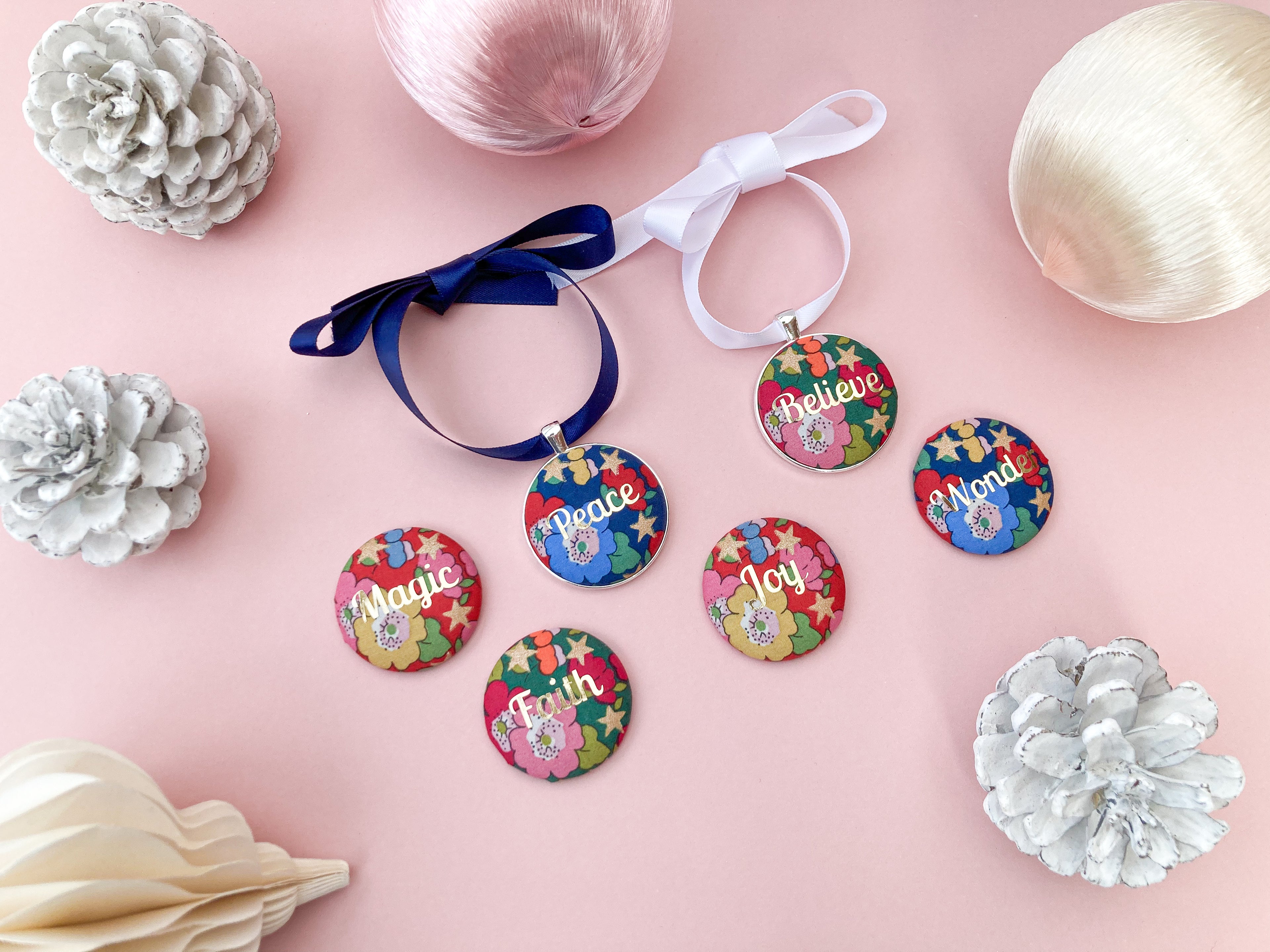 Necklaces, keyrings, tote bags and pins which capture beautiful Liberty of London fabrics, uplifting colours, joyful patterns and kind words.