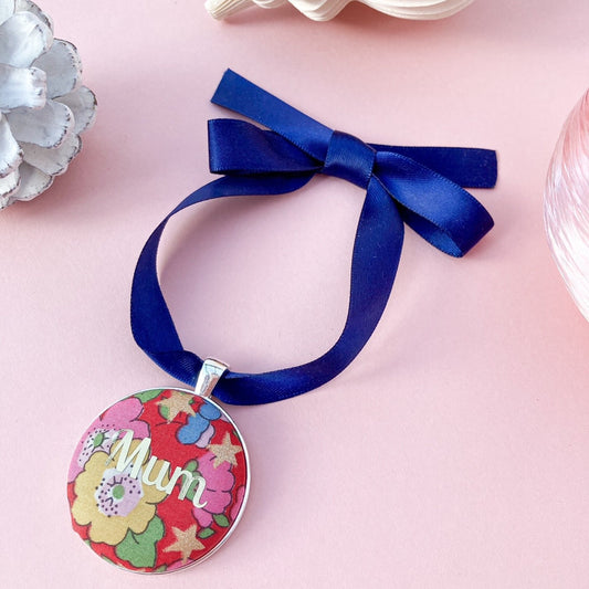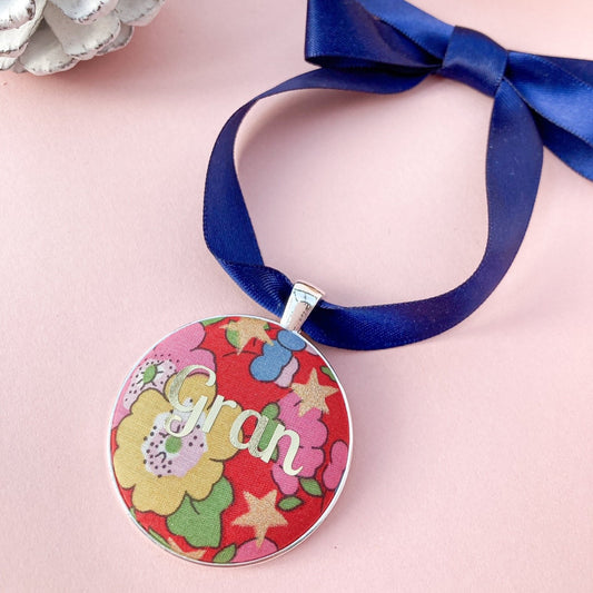 Ellie Bea Jewellery Christmas Keepsakes are made with beautiful Liberty of London fabrics in vibrant festive colours & shimmering gold stars. A unique Christmas decoration in a silver plated setting, which you can hang anywhere and bring out year after year. Featuring a thoughtful Christmas word such as Believe, Wonder, Magic, Faith, Peace and Joy to bring a spark of festive joy.