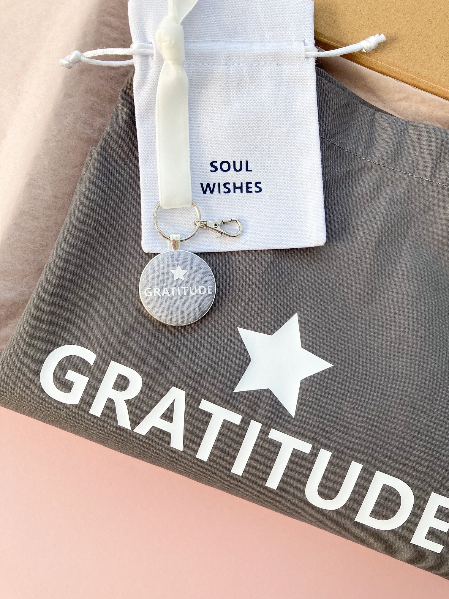 Made up of a Soul Wishes Gratitude Tote Bag and coordinating Gratitude Keyring featuring a star design - representing everything we are thankful for; taking a moment to appreciate what we have right now & feeling grateful for even the little things - putting us in a positive mindset for the day ahead.